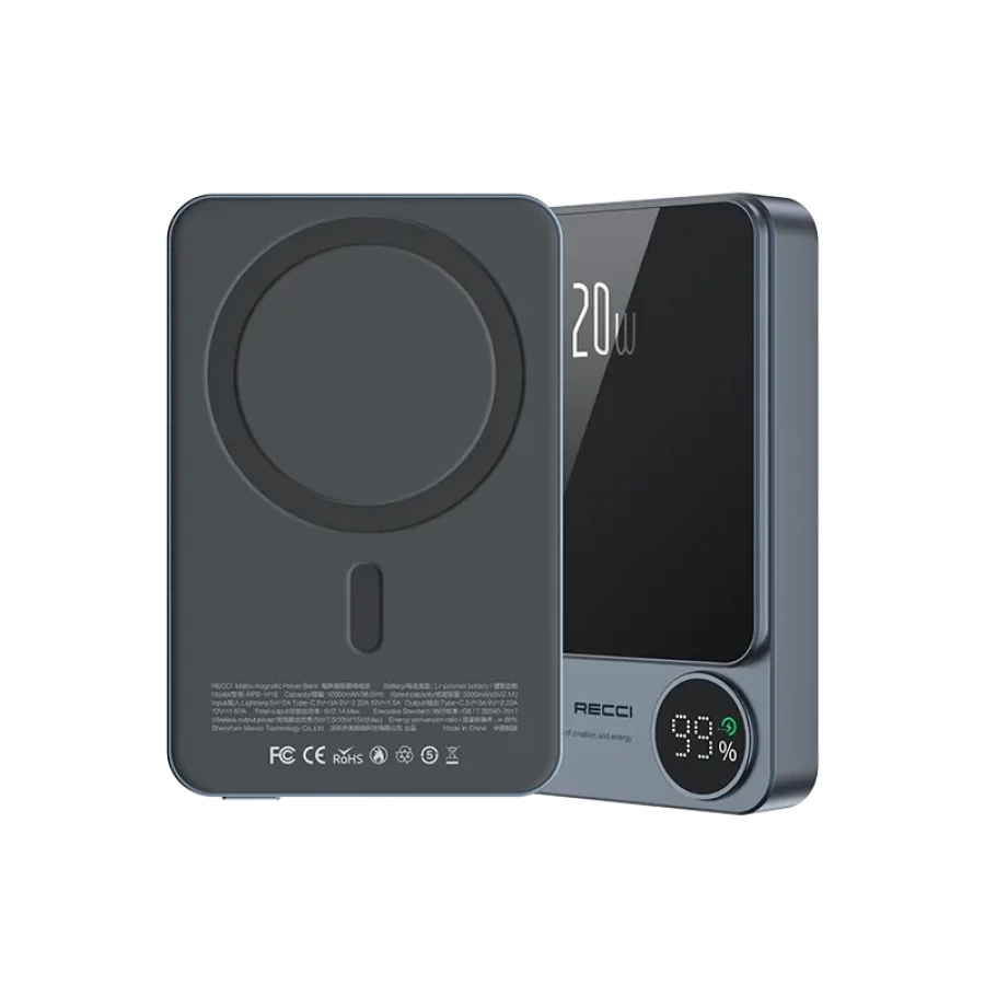 Đây là mẫu pin dự phòng tiêu biểu của Recci với dung lượng định mức 5000mAh, hỗ trợ sạc nhanh PD 20W và sạc không dây 5–15W. Thiết kế nhỏ gọn, trọng lượng nhẹ giúp dễ dàng mang theo trong túi xách hoặc balo.