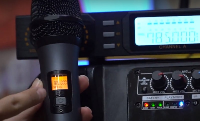 Sau khi cả hai thiết bị được bật, micro sẽ tự động tìm và bắt sóng với loa bluetooth. Khi tần số của loa hiển thị trên màn hình micro, điều đó có nghĩa là quá trình ghép nối đã hoàn tất.