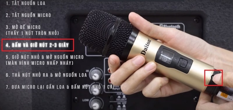 Bước 7: Đưa micro lại gần loa và nhấn nút nhỏ một lần nữa, micro sẽ tự động kết nối với loa bluetooth.