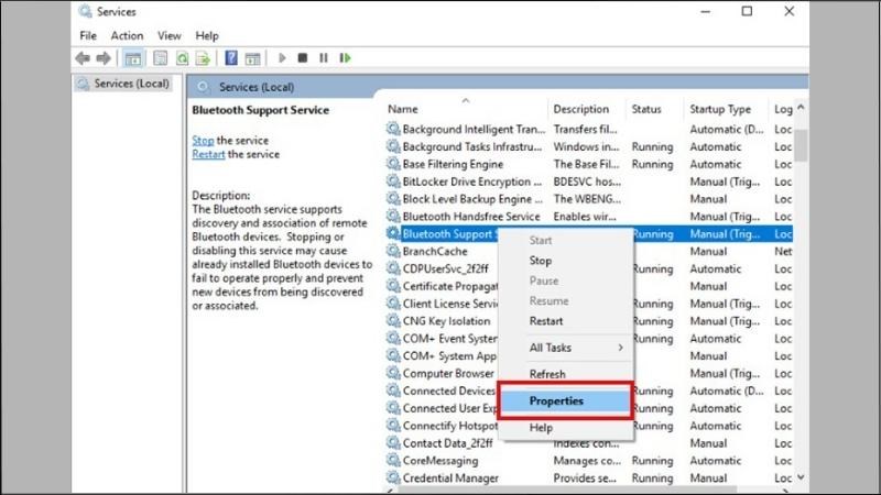 Bước 2: Tìm Bluetooth Support Service và mở mục Properties.